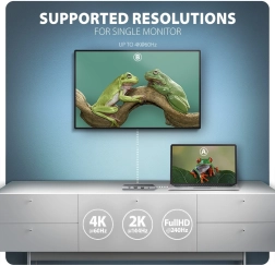 - 1× HDMI (A) femelă; 4K 4096×2160 până la 60 Hz, 2560×1440 până la 120 Hz, 1920×1080 până la 240 Hz; necesită DP Alt Mode 1.4+ sau Thunderbolt 3/4