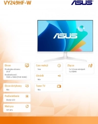 ASUS VY249HF-W este un monitor versatil cu panou IPS de 23,8", potrivit pentru utilizare zilnică, învățare online și multimedia. Rata de reîmprospătare de 100 Hz și tehnologiile pentru afișare fluidă asigură vizionare confortabilă fără sacadări. Datorită tehnologiei IPS obții culori stabile și unghiuri largi de vizualizare.
