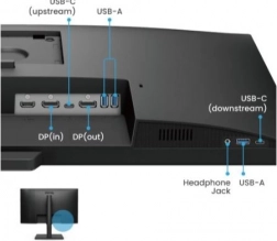 Monitorul este conceput pentru utilizare îndelungată la birou. Suportul ergonomic permite înclinare de la -5° la 15°, rotire ±20° și pivot de 90° pentru modul „portret”. Conectivitatea bogată include USB‑C, HDMI, DisplayPort (in/out) pentru conectarea facilă a mai multor ecrane, hub USB‑A pentru periferice și ieșire pentru căști.