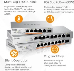 Zyxel XMG-108 este alegerea ideală pentru gameri, creatori de conținut și mici birouri. Oferă debit 2,5G pe toate cele opt porturi metalice și, în plus, 10G SFP+ pentru conectarea NAS-ului, a serverului sau uplink către backbone de mare viteză. Implementarea este instantanee – pur și simplu conectezi și pornești.