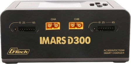 Gens Ace IMARS D300 G‑Tech este un încărcător AC/DC inteligent, conceput atât pentru bateriile G‑Tech Eco, cât și pentru pachetele obișnuite. Recunoaște automat tipul bateriei G‑Tech, tensiunea și curentul de încărcare recomandat, astfel că încărcarea este rapidă, precisă și sigură. Cele două canale independente permit încărcarea simultană a două baterii, până la AC 300 W sau DC 2×350 W.