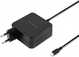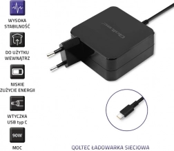 Încărcătorul de rețea de la Qoltec cu o putere de 90 W. Are cablu integrat cu conector USB Type-C.