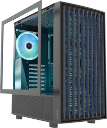 Panoul lateral din sticlă securizată cu încuietori rapide tip click accelerează accesul la componente fără a folosi șuruburi. Interiorul găzduiește cooler CPU până la 175 mm și placă video până la 330 mm (până la 360 mm după demontarea ventilatoarelor frontale). Pentru stocare este pregătit un coș în tunelul sursei pentru 2 discuri (SSD/HDD) și locații suplimentare M.2 în funcție de placa de bază.