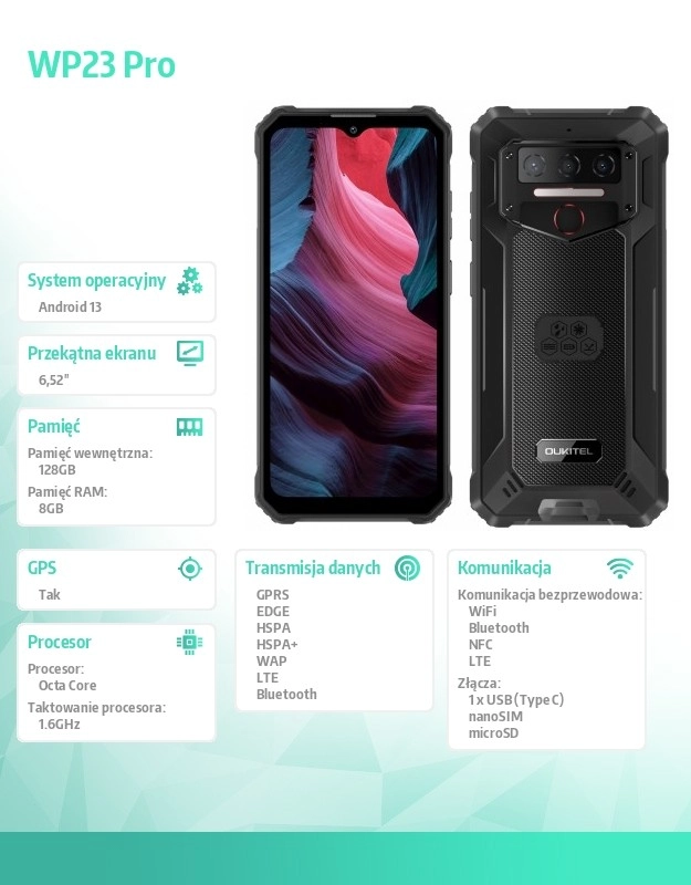 Oukitel WP23 Pro este un smartphone rezistent, ideal pentru utilizatorii care au nevoie de un dispozitiv fiabil în condiții extreme. Datorită certificărilor IP68, IP69K și MIL-STD-810H, oferă protecție excepțională împotriva apei, prafului și șocurilor. Bateria sa mare de 10.600 mAh asigură o autonomie lungă, indiferent unde te afli.