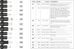 Include vârfuri de la M4 la M19 cu specificații detaliate precum tensiunea și modelele de notebook-uri compatibile.