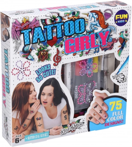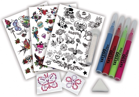 Set de tatuaje cu markere pentru copii de la 3 ani. Include markere pentru tatuaje, tatuaje, pietricele, burete, pensulă și sclipici.