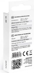Cititorul de carduri Savio AK-72 oferă viteză mare de transfer a datelor până la 480 Mbps datorită suportului USB 2.0. Suportă diverse formate de carduri de memorie, inclusiv SD, SDHC, SDXC, microSD, microSDHC și microSDXC, ceea ce îl face un instrument versatil pentru transferul fișierelor între dispozitive.