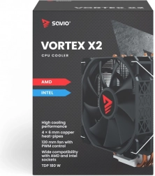Răcitor Procesor Savio Vortex X2 este echipat cu patru conducte de căldură din cupru, care disipează eficient căldura de la procesor și asigură funcționarea stabilă a sistemului. Ventilatorul de 120 mm operează la o viteză de rotație între 800 și 1800 RPM, oferind un flux de aer optim la un nivel redus de zgomot. Datorită compatibilității cu o gamă largă de socket-uri Intel și AMD, instalarea pe diferite platforme este ușoară.