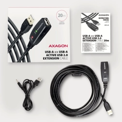 Cablu prelungitor activ Axagon USB 2.0 cu lungimea de 20 de metri este destinat extinderii conexiunii USB între computer și dispozitive precum mouse, tastatură, cameră web, imprimantă sau scanner. Cablu conține un repetor integrat, ce amplifică semnalul transmis, permițând utilizarea cablului pe distanțe mai mari.