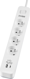 Protejați-vă locuința și biroul cu prelungitorul cu protecție la supratensiune EVER Protect, cu patru prize împământate și două porturi USB (USB‑A + USB‑C). Datorită încărcătorului rapid integrat, cu putere de până la 3,4 A, încărcați cu ușurință smartphone-uri, tablete și ceasuri inteligente. Funcționarea în siguranță este asigurată de protecția la supratensiune, protecția pentru copii, întrerupătorul bipolar și indicatoarea LED a stării de protecție.