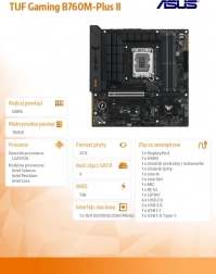 ASUS TUF Gaming B760M‑PLUS II valorifică procesoarele Intel pentru socketul LGA1700 și oferă o combinație echilibrată de funcții pentru gaming, durabilitate și asamblare facilă. Datorită alimentării întărite, radiatoarelor de calitate și testelor riguroase de stres, placa este pregătită pentru maratoane de joc fără compromisuri în stabilitate.