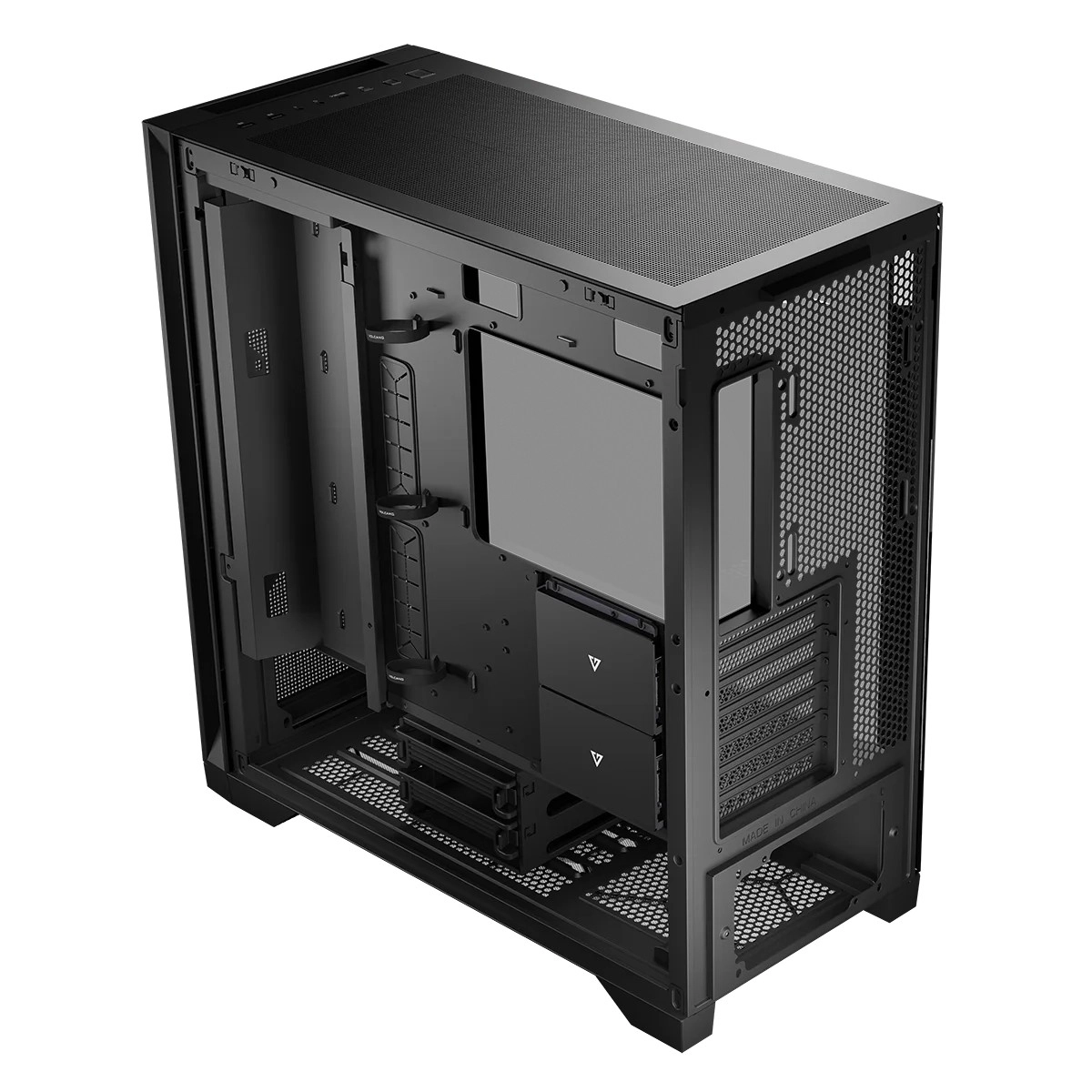 Șasiul Volcano Expanse S MIDI îți permite să organizezi interiorul astfel încât computerul să fie cu adevărat al tău! La înălțimea plăcii de bază există un spațiu dedicat pentru montarea unui canal de cabluri sau a unui cadru de ventilatoare. Doar de tine depinde cum folosești această opțiune de organizare a interiorului PC-ului. Canalul îți permite să gestionezi cablurile și să menții interiorul carcasei ordonat. Este soluția ideală pentru cei care își mențin PC-ul în stare bună și apreciază în primul rând estetica. Dacă construiești un adevărat „monstru de gaming” și ai nevoie de cea mai bună răcire pentru componentele tale, poți înlocui canalul cu un cadru pentru trei ventilatoare suplimentare de 120 mm.