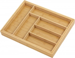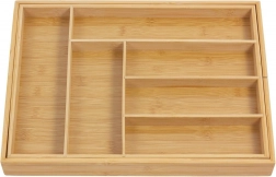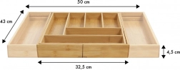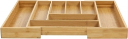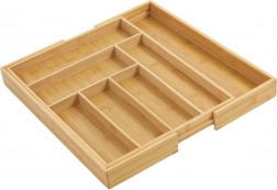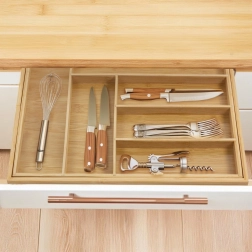 Păstrează ordinea în bucătărie cu organizatorul universal din bambus, care se adaptează sertarului tău. Părțile laterale extensibile creează spațiu suplimentar, iar împreună cu despărțitoarele solide mențin totul clar organizat la locul său. Aspectul natural din bambus masiv se potrivește atât interioarelor moderne, cât și celor clasice.