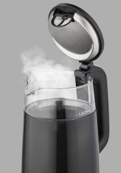 Carcasa fierbătorului este realizată din plastic, în timp ce interiorul este din sticlă borosilicată de înaltă calitate, asigurând durabilitate și curățare ușoară.