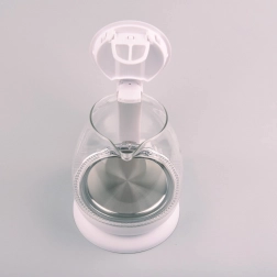 Accesul ușor la interiorul fierbătorului este asigurat de un buton pentru deschiderea capacului, iar indicatorul de nivel al apei facilitează controlul cantității de apă din rezervor. Iluminarea albastră semnalează funcționarea aparatului, oferindu-i un aspect modern.