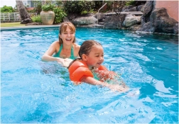 Datorită acestor mânecuțe, copiii se pot bucura de momente vesele în apă, în timp ce învață să înoate sub supraveghere, așa cum arată atmosfera relaxată de la piscină.