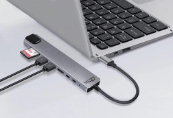 Căutați un hub universal pentru lucru și divertisment? Această stație de andocare multiport 8 în 1 oferă conexiune prin cablu stabilă prin RJ45 Gigabit LAN, imagine clară ca cristalul prin HDMI până la 4K și transfer rapid de fișiere datorită USB‑A 3.0 (5 Gb/s). În același timp alimentează dispozitivele prin USB‑C PD 100 W, astfel încât puteți lucra confortabil și cu un laptop performant.