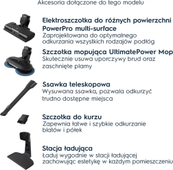 Pachetul aspiratorului include: perie electrică pentru covoare și pardoseli dure cu iluminare LED PowerPro Multifloor, perie pentru spălare PowerPro Mop, duză telescopică pentru spații înguste, perie de praf, stație de încărcare. Accesul facil la unitatea de mână și la accesoriile incluse vă permite să aspirați temeinic și rapid diverse suprafețe – de la podea până la colțurile greu accesibile.