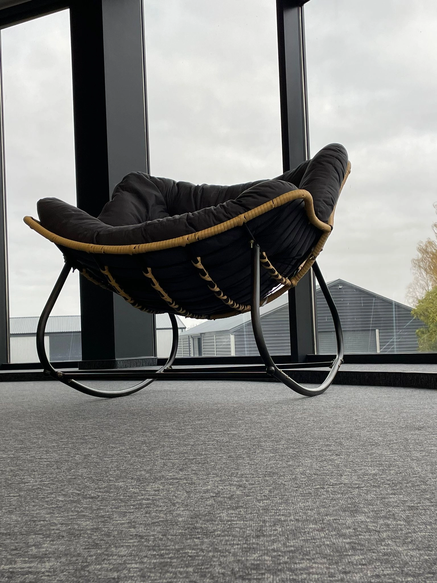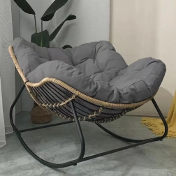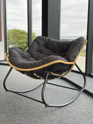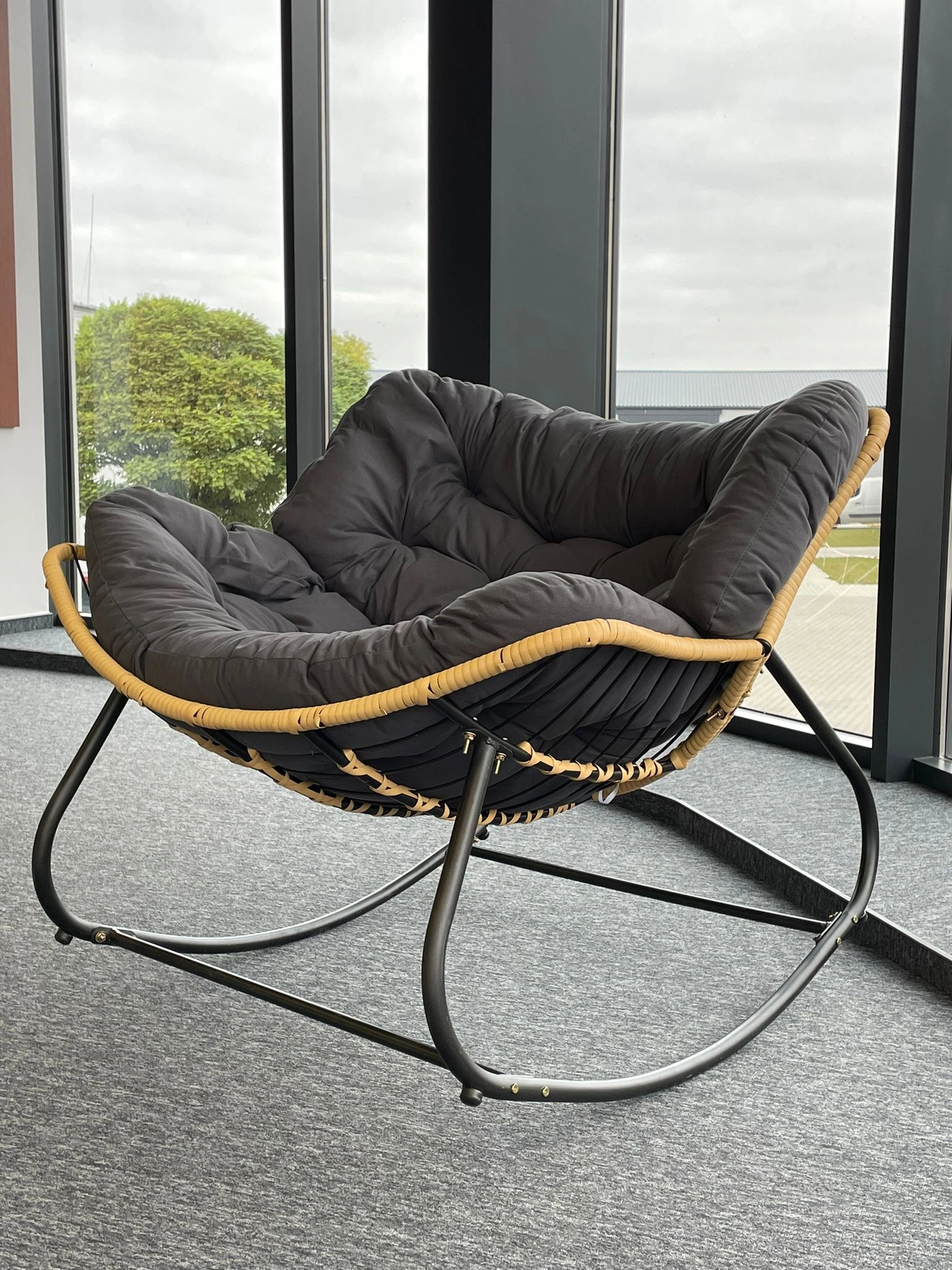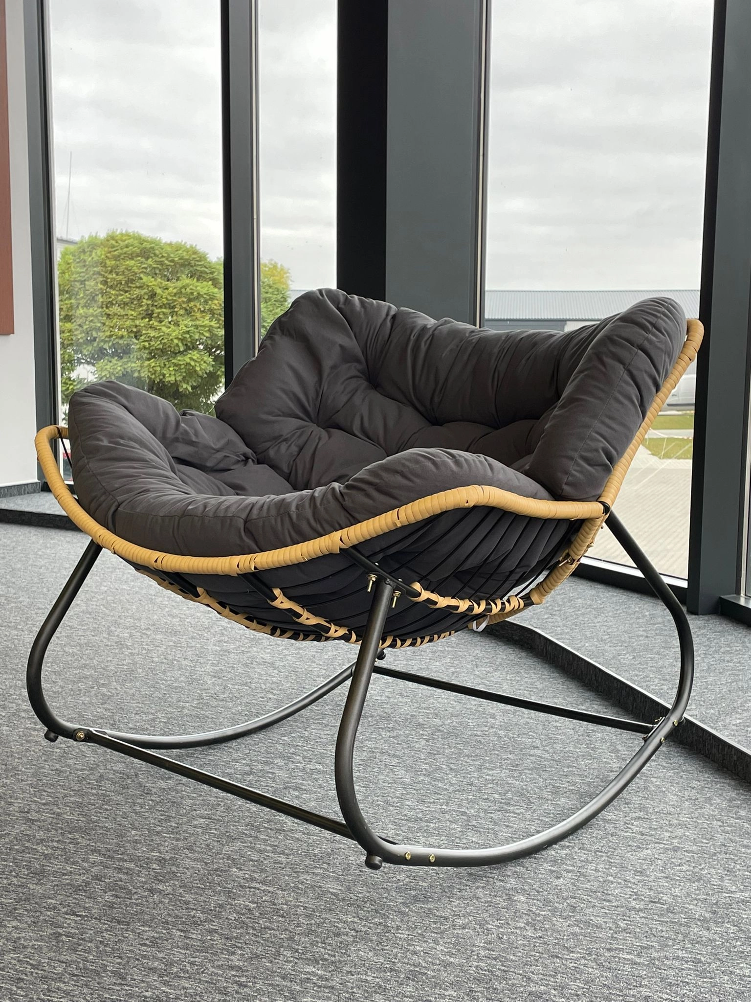 Fotoliu balansoar stilat, realizat din ratan de înaltă calitate, ideal pentru interioare care îmbină elementele naturale cu designul modern. Perna moale gri oferă confort deosebit, în timp ce construcția robustă asigură durabilitate. Acest fotoliu este o alegere excelentă pentru living, dormitor, hotel sau birou și servește ca accent elegant și în spațiile comerciale.