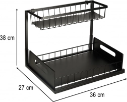 Construcția robustă, în întregime din metal, de culoare neagră, se potrivește perfect bucătăriei sau băii moderne. Structura este proiectată astfel încât să se potrivească în majoritatea dulapurilor și să nu împiedice instalațiile sanitare. Ideal pentru detergenți, bureți, pungi, mănuși și alte accesorii.