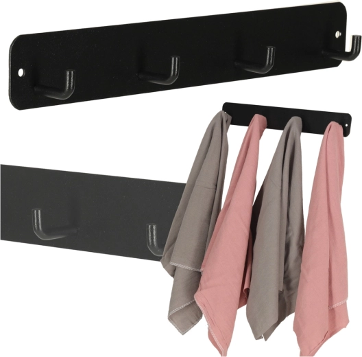 Patru cârlige distribuite uniform susțin prosoape, halate și genți, economisind spațiu pe perete.