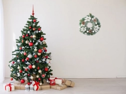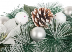 Combinația dintre cetina verde, florile albe, conurile naturale și decorațiunile argintii creează un aspect elegant și festiv, potrivit pentru orice interior.