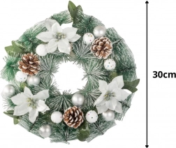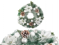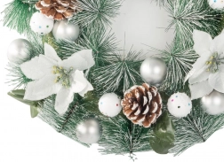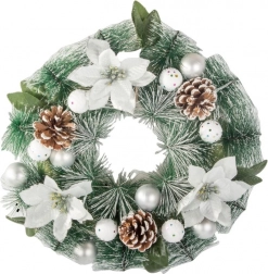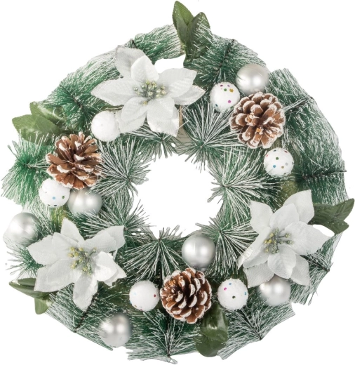Creează acasă o atmosferă festivă deosebită cu coronița decorativă de Crăciun, care se remarcă prin combinația armonioasă de cetină verde, flori albe, conuri și delicate decorațiuni argintii. Aspectul natural îmbogățește ușa de la intrare, livingul sau zona de dining.