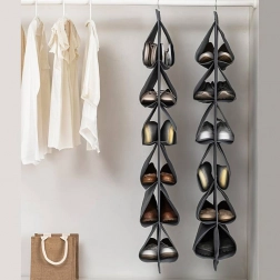 O soluție practică și elegantă pentru orice garderobă. Organizatorul suspendat pentru pantofi cu 12 buzunare depozitează perechile vertical, astfel câștigi mai mult spațiu și o vizibilitate mai bună. Țesătura rezistentă cu cusături întărite protejează încălțămintea de zgârieturi și praf, iar cârligul metalic garantează o fixare stabilă.