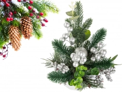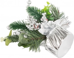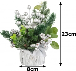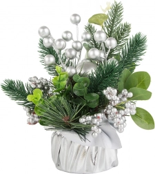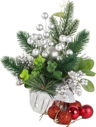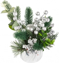 Bucurați-vă de atmosfera sărbătorilor cu această minunată decorațiune de Crăciun, care îmbină măiestria artistică și eleganța. Bilele și ornamentele argintii oferă decorului un aspect elegant, de iarnă, care se potrivește perfect printre decorațiunile tradiționale de Crăciun. Întregul aranjament este îmbrăcat într-o țesătură argintie, creând un ansamblu coerent și stilat.