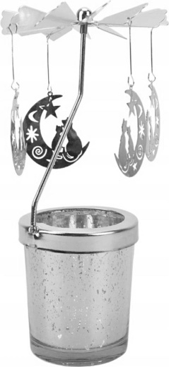 Suportul nostru rotativ pentru lumânare este proiectat în formă de ghiveci și se remarcă printr-un suport unic cu 4 luni care se rotesc elegant în jurul axei lor când sunt încălzite de lumânarea aprinsă. Foliolele strălucitoare captează lumina lumânării, creând un efect vizual minunat. Prin posibilitatea de amplasare pe o suprafață plană, devine o decorare excelentă nu doar în perioada sărbătorilor.