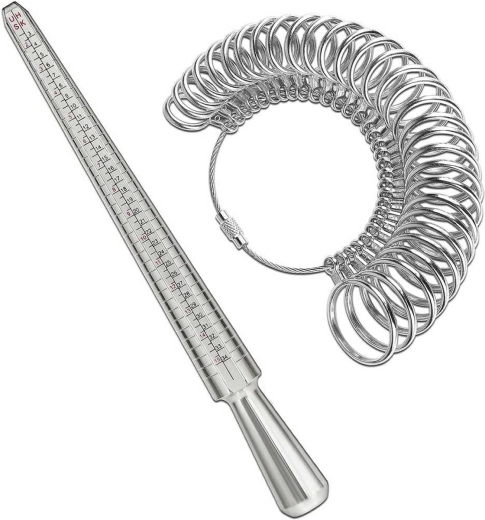 Metru de bijutier din oțel pentru determinarea mai ușoară a mărimii inelelor și verighetelor. Articol extrem de util și pentru uz casnic. O necesitate pentru orice bijutier și orfevrier. Setul permite verificarea imediată a mărimii degetului cu ajutorul unui set de inele numerotate. Pentru măsurarea diametrului degetului se folosește un diblu special.