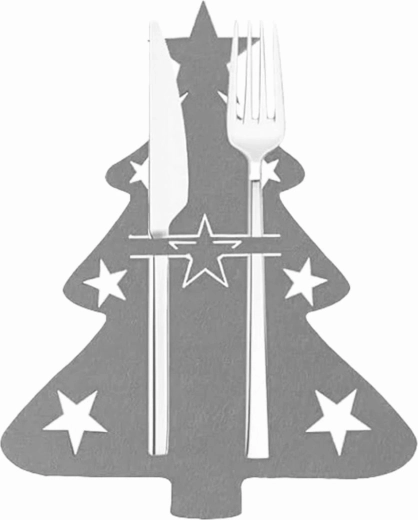 Husă pentru tacâmuri în formă de brad de Crăciun. O idee grozavă pentru decorarea mesei de Crăciun. Potrivită excelent ca decorațiune de Crăciun. Execuție estetică și decupaje în formă de steluțe. Produsul este realizat din fetru moale, plăcut la atingere, care nu alunecă pe masă.