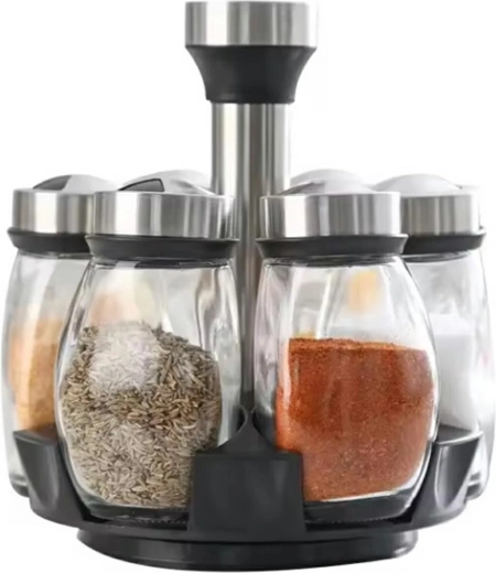- Set de 6 recipiente transparente pentru condimente, împreună cu o bază rotativă specială.