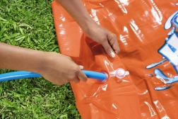 Instalare rapidă și ușoară. Este suficient să desfășurați toboganul pe gazon și să conectați un furtun. Ancorajele speciale asigură rămânerea fermă a toboganului pe loc.