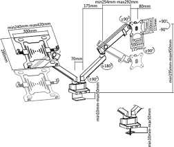 Este echipat cu o bază pentru laptop, care îmbunătățește confortul și ergonomia la locul de muncă. Brațele din aluminiu de înaltă calitate sunt echipate cu o clemă de montare durabilă, care permite fixarea de masă sau alte suprafețe plane fără necesitatea de a găuri. Soluția ideală pentru utilizare atât în birou, cât și acasă.