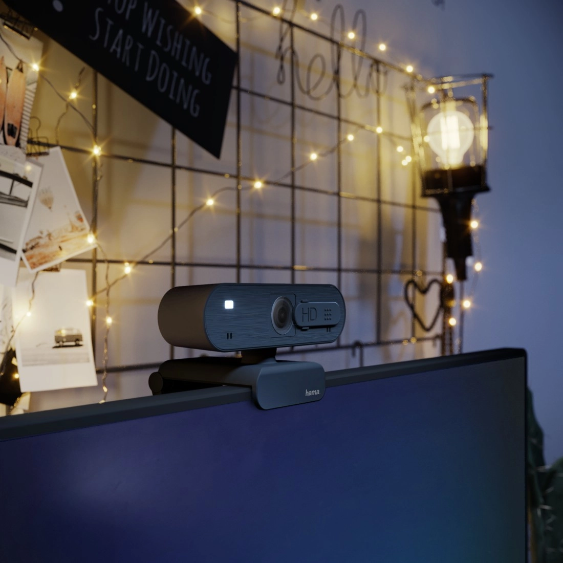 Cameră web Hama fiabilă pentru munca de acasă și apeluri video la calitate de top. Oferă imagine Full HD 1080p, autofocus pentru cadre mereu clare, microfon stereo pentru voce clară, ajustare automată a iluminării și capac integrat pentru confidențialitate.