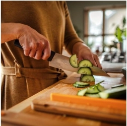 Mânerul ergonomic cu finisaj SoftGrip oferă o prindere fermă, în timp ce protecția mare pentru degete sporește confortul și siguranța. Cuțitul este ușor de curățat și potrivit pentru mașina de spălat vase. Un cuțit perfect pentru bucătarii moderni care caută calitate și versatilitate.