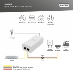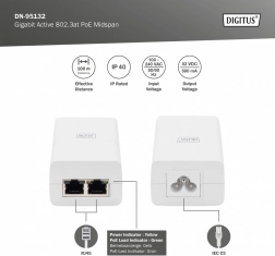 Un injector PoE midspan activ pentru utilizare în interior combină datele și alimentarea într-un singur cablu Ethernet și simplifică semnificativ instalarea echipamentelor de rețea. Suportă IEEE 802.3at (PoE+) cu retrocompatibilitate cu IEEE 802.3af, oferă ieșire de 52 V DC / 0,58 A (până la 30 W) și funcționează la viteze de 10/100/1000 Mb/s. Cele două porturi RJ45 (LAN și PoE) permit alimentare și transfer de date fără probleme pe distanțe de până la 100 de metri prin cablu Cat5e/Cat6.