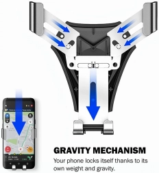 Bucurați-vă de utilizarea sigură și confortabilă a telefonului în timpul condusului. Mecanismul gravitațional se blochează prin greutatea proprie a telefonului, astfel încât dispozitivul rămâne stabil chiar și pe denivelări. Suportul se montează pe grila de ventilație, iar datorită prinderii cauciucate nu deteriorează lamelele.