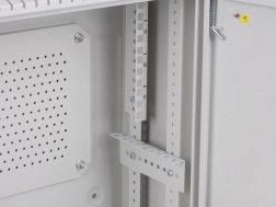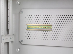 Pe partea din spate se află o placă de montaj perforată (mesh) pentru șuruburi M4 și o șină DIN inclusă pentru fixarea ușoară a accesoriilor. Sunt incluse conductorul de împământare, ancorele și șuruburile M6 pentru o fixare solidă și sigură. Opt pătrunzătoare detașabile în panoul posterior oferă flexibilitate pentru traseele cablurilor de alimentare și date.