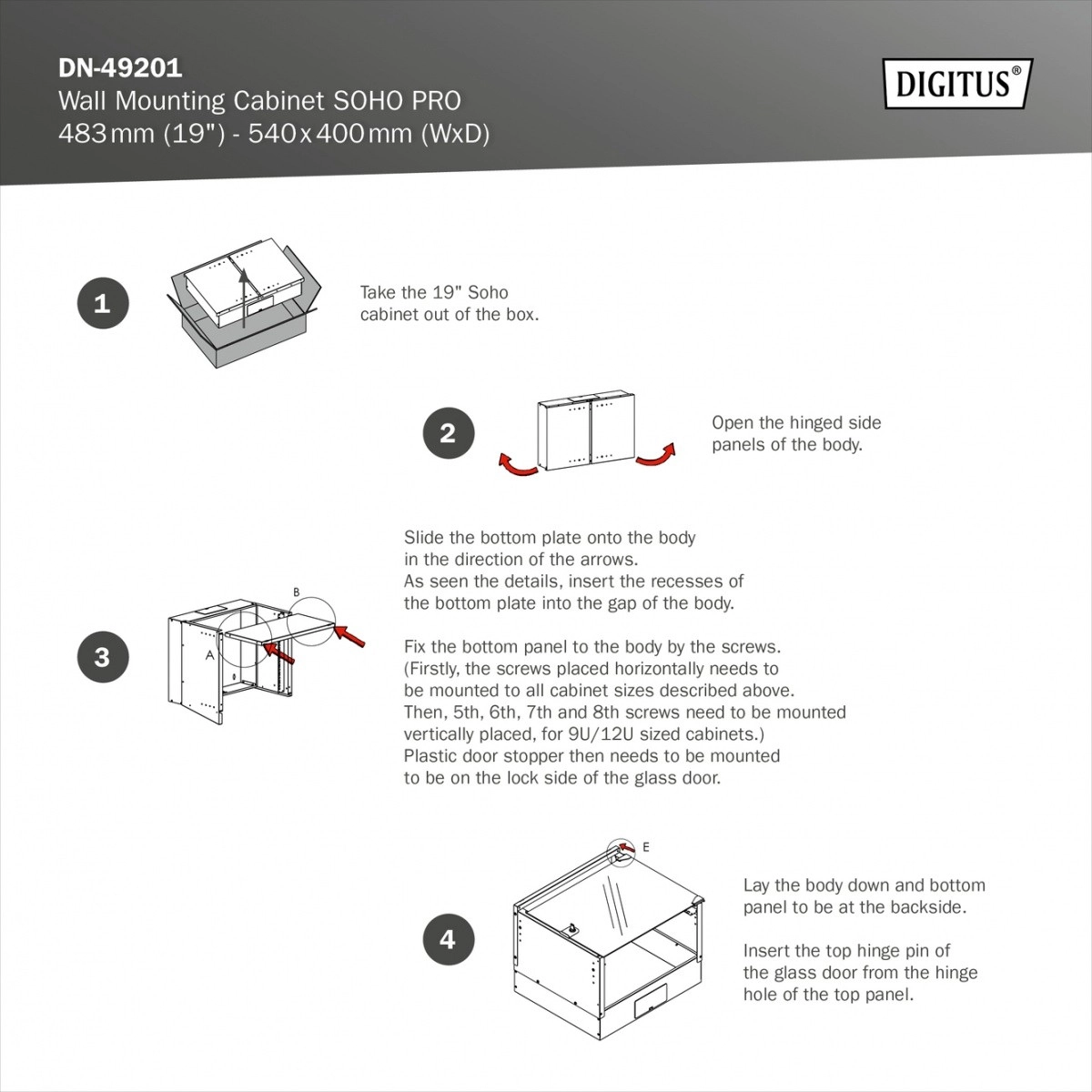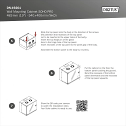 Livrarea în ambalaj plat economisește spațiu și timp. Profilele galvanizate de 19" cu adâncime reglabilă și balamalele reversibile ale ușii simplifică instalarea.