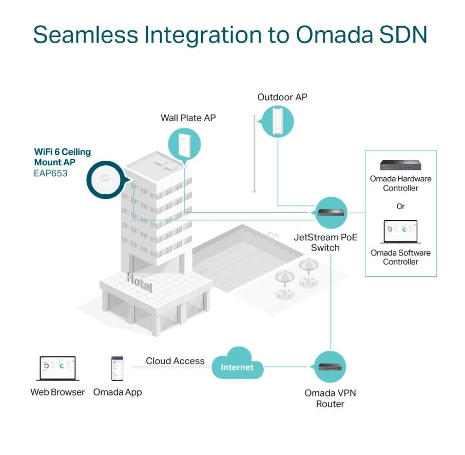 Management centralizat în cloud: Integrarea cu platforma Omada SDN permite administrarea rețelei local sau de la distanță prin cloud, prin interfața web sau aplicația Omada.