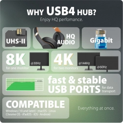 Cititorul integrat UHS‑II pentru SD și microSD permite importuri rapide până la 312 MB/s și lucru simultan în ambele sloturi. DAC-ul de calitate oferă ieșire stereo curată 24 bit/384 kHz și intrare de microfon pentru apeluri și creație de conținut. Power Delivery 3.0 până la 100 W alimentează laptopul și dockul, iar alimentarea suplimentară USB-C 5 V face față perifericelor USB cu consum ridicat.