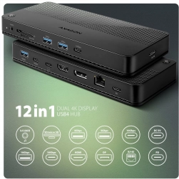 Stația de andocare AXAGON HMC-U4 12‑în‑1 îți extinde dispozitivul cu porturi esențiale pentru muncă și divertisment. Suportă USB4 și compatibilitate Thunderbolt, astfel gestionează conexiuni exigente de date, video și alimentare. Conectează 2 monitoare externe prin HDMI și DisplayPort cu rezoluție până la 8K/30 Hz sau 4K/144 Hz, folosește ethernet gigabit pentru rețea stabilă și transferă fișiere cu viteze de până la 10 Gb/s prin USB-C/USB-A.