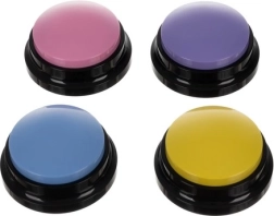 Patru butoane colorate intens în albastru, roz, galben și violet, toate cu bază neagră, atrag atenția nu doar a animalului tău de companie.