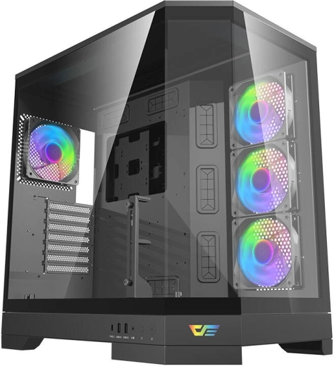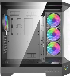 Descoperiți eleganța și funcționalitatea carcasei de calculator cu iluminare RGB, care este o alegere ideală atât pentru entuziaști, cât și pentru profesioniști. Datorită panourilor duble de sticlă pe partea frontală și laterală, puteți admira iluminarea și aranjamentul interior al componentelor.
