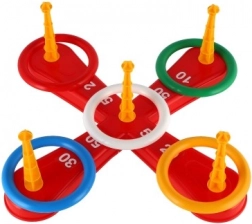 Jocul conține o bază în formă de cruce și inele viu colorate pentru aruncare distractivă.