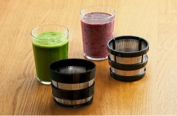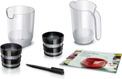 Toate componentele din plastic care intră în contact cu alimentele sunt fără BPA și pot fi spălate comod în mașina de spălat vase. Motorul durabil, foarte silențios de 150 W, cu aproximativ 55 rpm, asigură randament ridicat al sucului cu zgomot minim. În pachet se află și o carte de rețete plină de idei pentru sucuri, smoothie-uri și băuturi sănătoase.