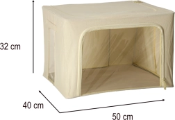 Acest organizator textil crem este ideal pentru plăpumi din puf, perne, pături, prosoape și haine de sezon. Datorită deschiderii frontale cu fermoar puteți scoate comod lucrurile și de pe rafturile inferioare fără a muta cutia. Peretele frontal transparent vă permite să vedeți imediat ce este în interior.
