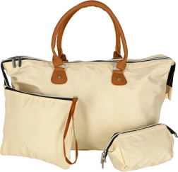 Setul include 2 punguțe practice – una mai mare pentru scutece sau cosmetice și una mai mică pentru mărunțișuri, precum suzete sau șervețele. Datorită designului universal, geanta este potrivită nu doar pentru cărucior, ci și ca geantă de călătorie sau pentru folosință zilnică.